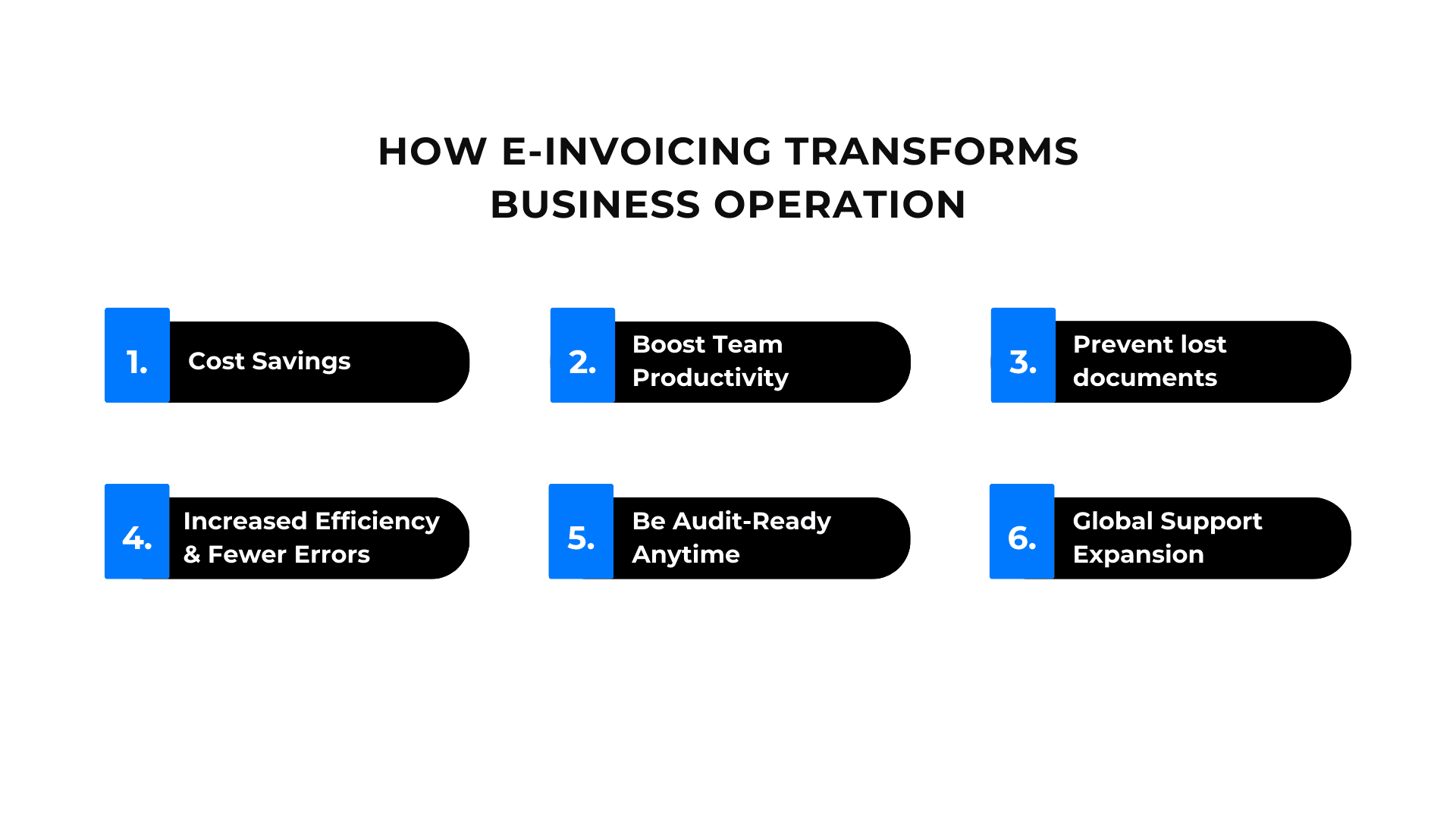 - Cost Savings: E-invoicing reduces costs by eliminating paper expenses tied to printing, posting, and archiving.