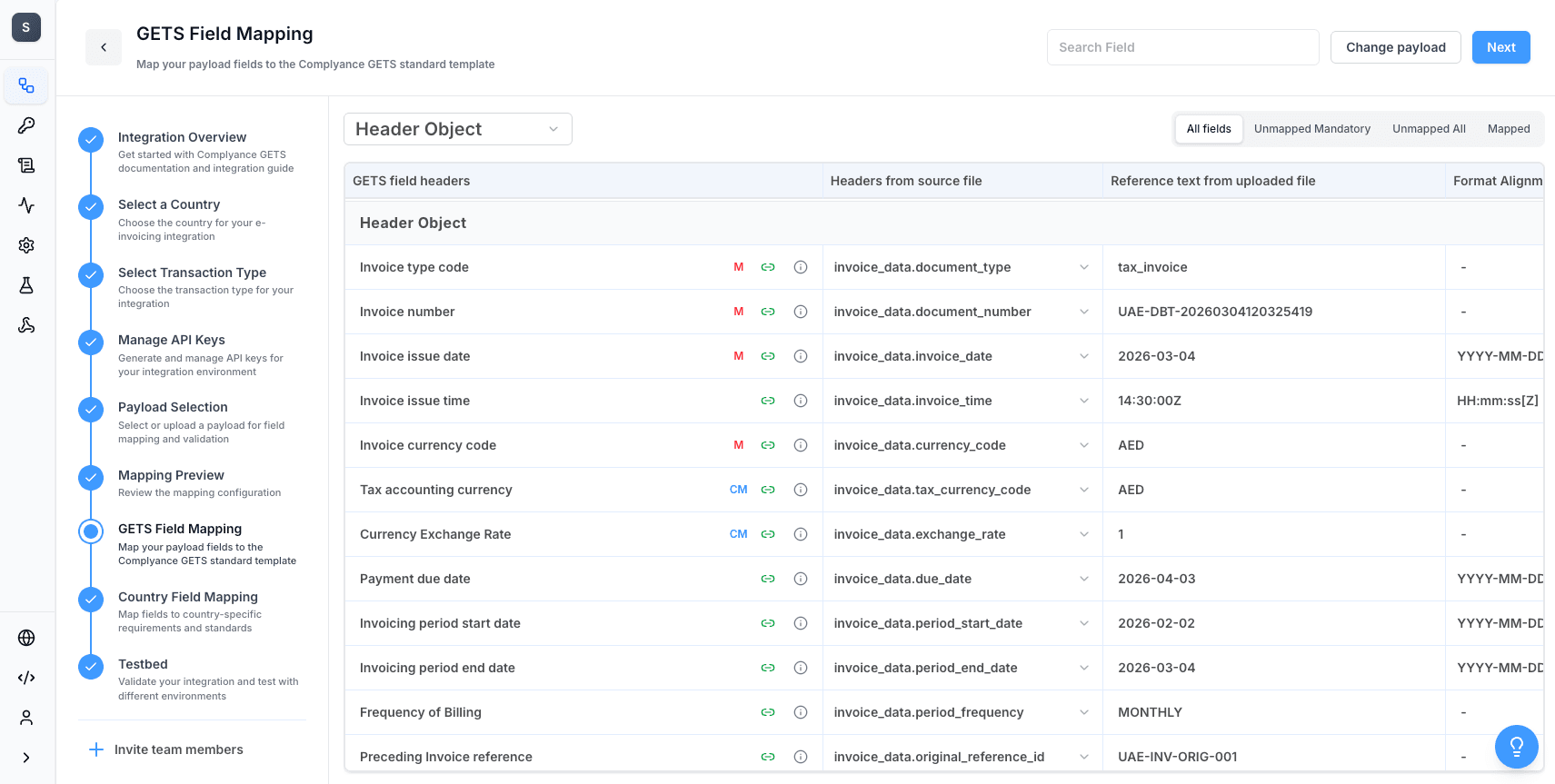 The sidebar also shows a progress-driven checklist tracking your integration from country selection all the way through test mapping, so you always know exactly where you are.Full API reference is at the Complyance API documentation.
